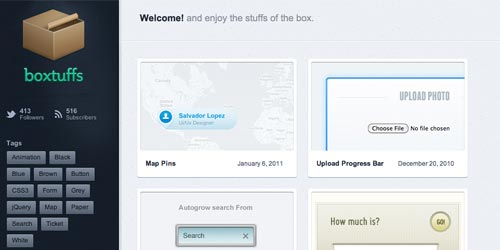 Boxtuffs 有很多免费的 PSD 素材及很酷的CSS3/HTML5实现的小功能(需要翻墙)。
