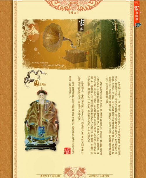 中国古代的文字是自上而下竖书成行,自右向左换行。这一特征也被广泛引用到网页设计中。竖排的布局方式呈现出浓浓的中国古典文化气息。