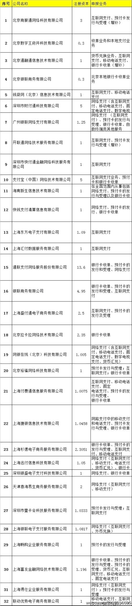 今日下午,据微博网友报料,包括支付宝、财付通、快钱在内的32家企业获得第三方支付牌照。