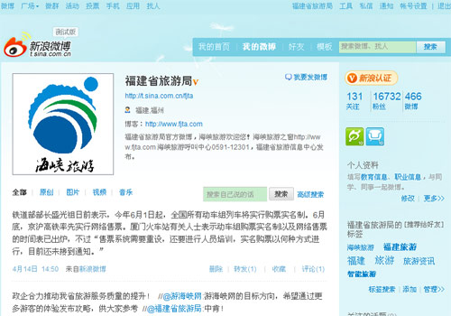 为响应国家旅游局《“十二五”发展规划纲要》要求,紧跟网络时代脚步,开展多渠道宣传营销,福建省旅游局于今年4月起,先后开通了新浪网、腾讯网官方微博,计划借助微博这一新兴网络传播方式全面推动“海峡旅游”网上营销和信息服务。自4月6日开通新浪微博以来,截至5月23日15点,福建省旅游局新浪微博(http://t.sina.com.cn/fjta)已经吸引了16732名“粉丝”的关注。于5月17日开通的腾讯微博(http://t.qq.com/fujianlvyou)听众也达到2605人。