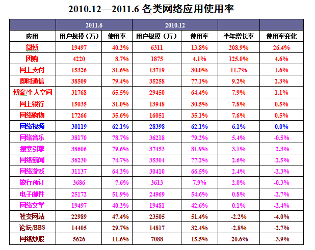 1、微博和团购是两个半年中应用增长超过100%的,这也意味着马上将遇到发展瓶颈。微博的瓶颈是已超过四成的使用率,而团购的瓶颈是自身的业务模式。